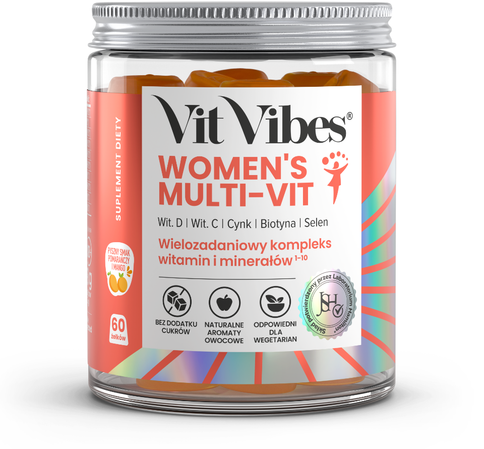 Formuła Vit Vibes® WOMEN’S MULTI-VIT opiera się na kompleksie witamin i minerałów dobranych z myślą o codziennych potrzebach kobiet, wspierających energię, odporność oraz dobre samopoczucie.
